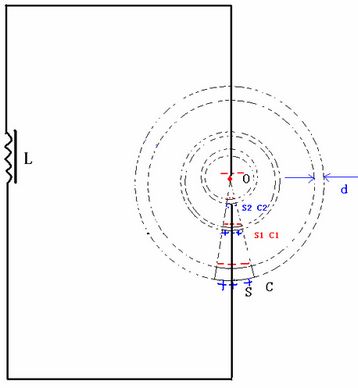 如圖7,在一個由“點(diǎn)電極”O(jiān)與“球冠電極”S組成的“球錐空間”中,如果O與S之間產(chǎn)生了足夠的“特高電壓”,那么這個“球錐空間”就可以被“雙向激擊”,依次連續(xù)發(fā)生“球冠振蕩”……、S2、……、S1、……、S,產(chǎn)生不同頻率的“電磁波球”,并且呈“嵌套球狀”分布,由外到里即由球冠S到點(diǎn)O,產(chǎn)生的“電磁波”的頻率越來越大。